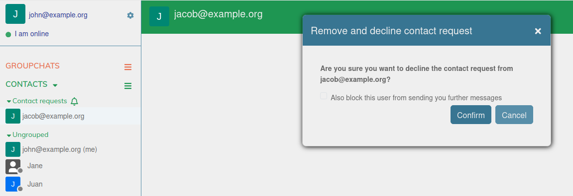 Next, I’ve rejected the contact request (by clicking ‘remove’), and confirmed the ‘remove and decline contact request’ dialog.
