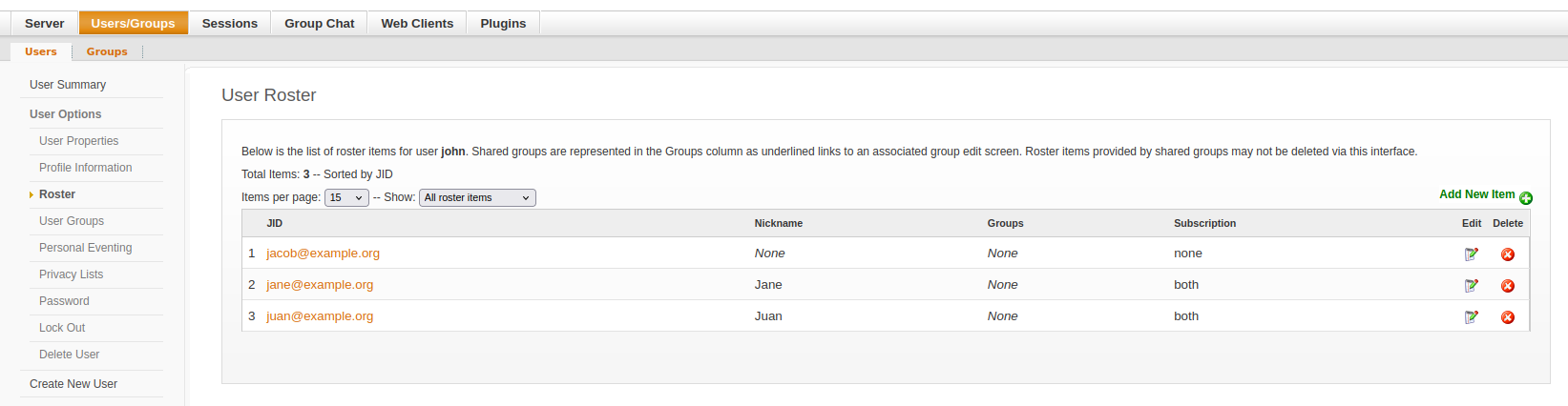 Looking at Openfire’s admin console, there unexpectedly is a entry in John’s roster for Jacob. There isn’t a subscription (it’s of type ‘none’).