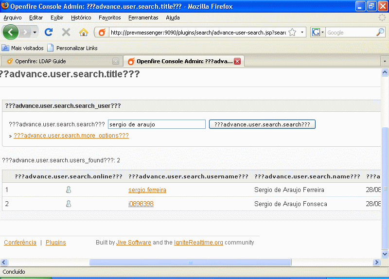 The other is the most important: Despite the advanced search is working fine at the Console Admin, at the rosters, the only field returned is the jabber id (see attached files). Until last month, the server version was 3.3.3, then it was updated to 3.5.2, when the problem appeared, and yesterday, it was updated to 3.6.0 and the problem remains. The search plugin version is the last one, 1.4.3 and server platform is Linux Red Hat EE.